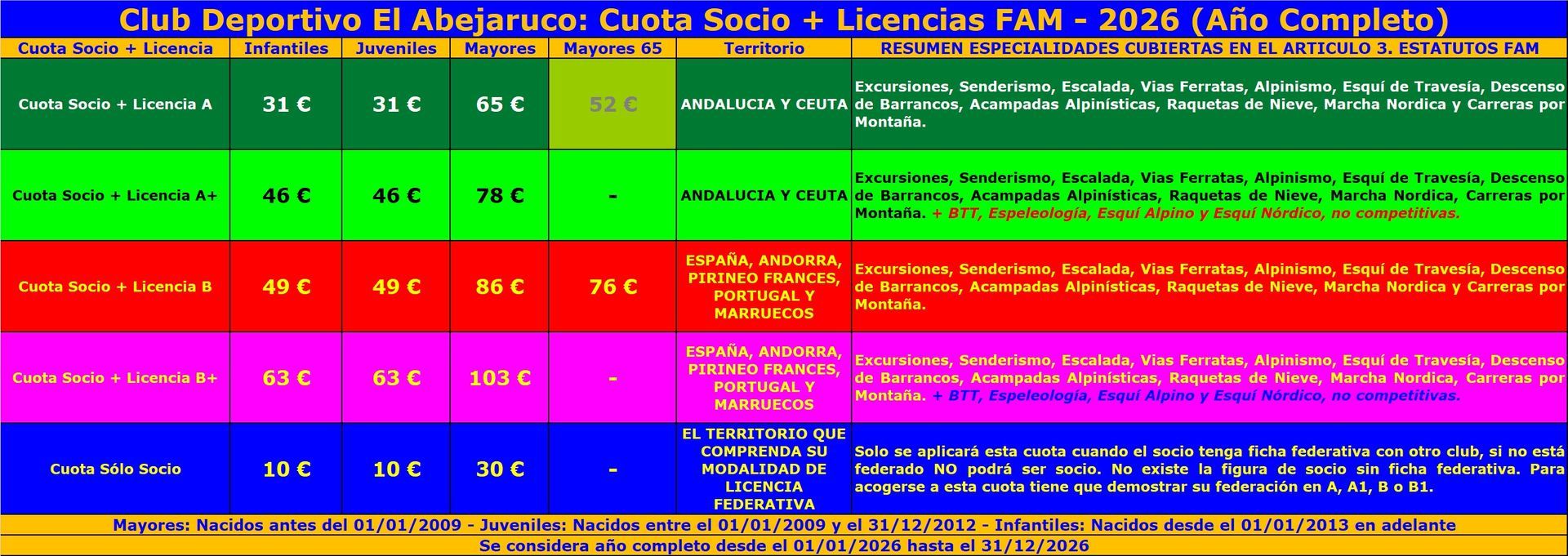 Aquí tenemos las cuotas de socio para el AÑO COMPLETO 2026 (01/01/2026 a 31/12/2026), incluidas las licencias de la Federación.